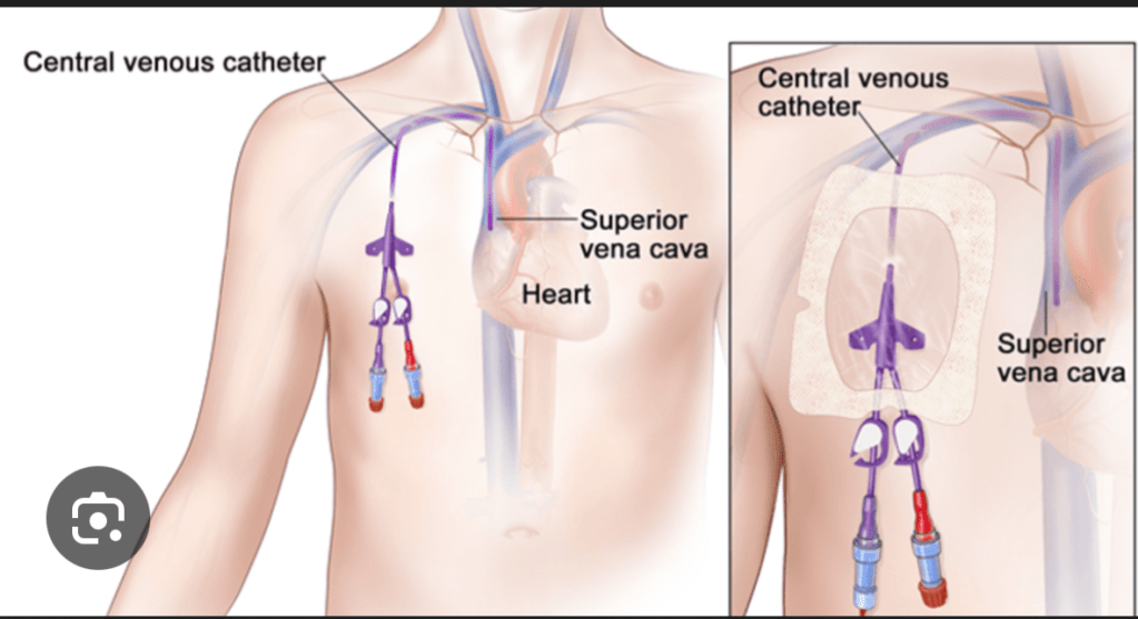 For those who don’t know, a Hickman line is a central catheter inserted into a large vein near the heart. It allows doctors to draw blood, give medications, and collect stem cells without constantly sticking new IVs into your arms.